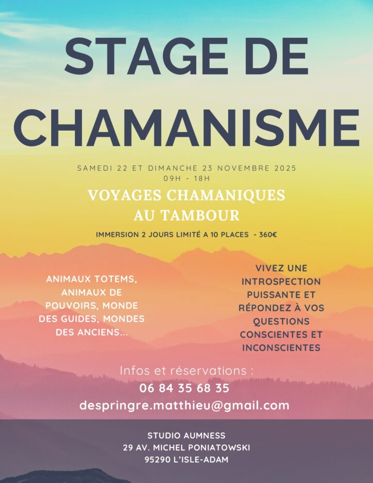 Tout au long du week-end, vous serez guidé pas à pas pour explorer les fondations du chamanisme et vivre vos premiers voyages chamaniques, dans un cadre bienveillant et sécurisant.